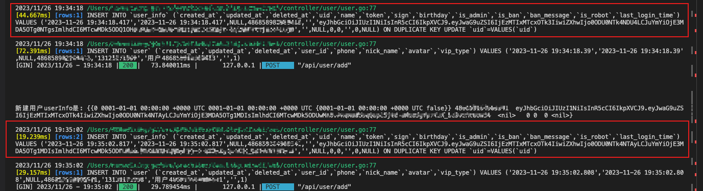 [27.498ms] [rows:2] INSERT INTO user_info (created_at,updated_at,deleted_at,uid,name,token,sign,birthday,is_admin,is_ban,ban_message,is_robot,last_login_time) VALUES ('2023-11-26 21:04:57.274','2023-11-26 21:04:57.274',NULL,486881260xxxxxx,'','eyJhbGciOiJIUzI1NiIsInR5cCI6IkpXVCJ9.eyJwaG9uZSI6IjEzMTIxMTcxOTk4IiwiZXhwIjo0ODU0NjAzODk3LCJuYmYiOjE3MDEwMDM4OTcsImlhdCI6MTcwMTAwMzg5N30.UprJeW_hr8GNgYl8YhbvRlcIdE9zyc0hzmZqtnZ3dmI','',NULL,0,0,'',0,NULL) ON DUPLICATE KEY UPDATE uid=VALUES(uid)