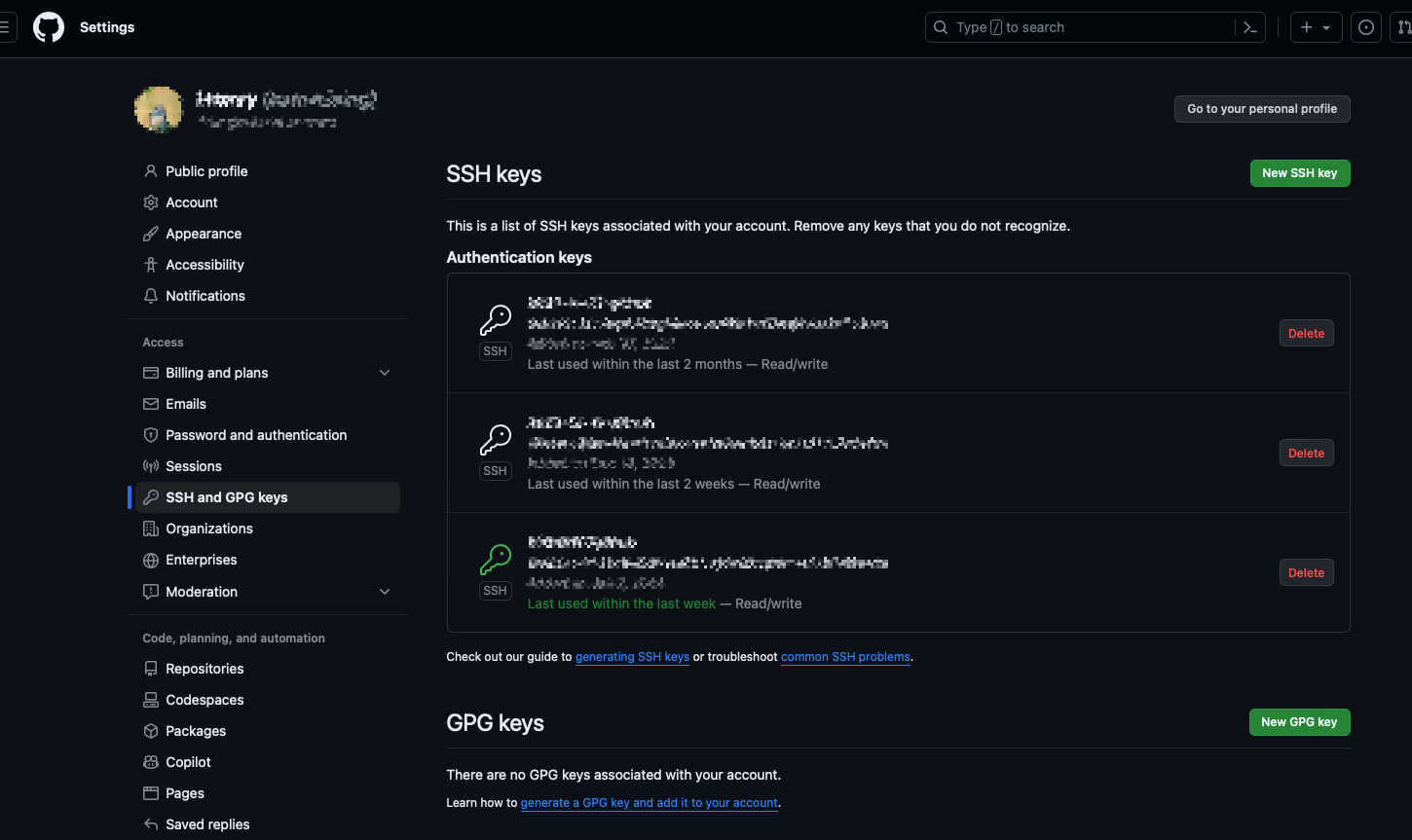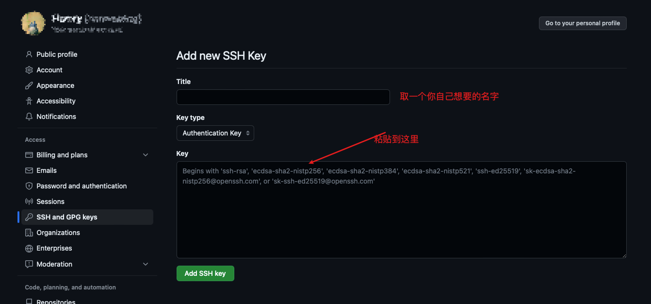 github上的ssh设置在profile->setting中: